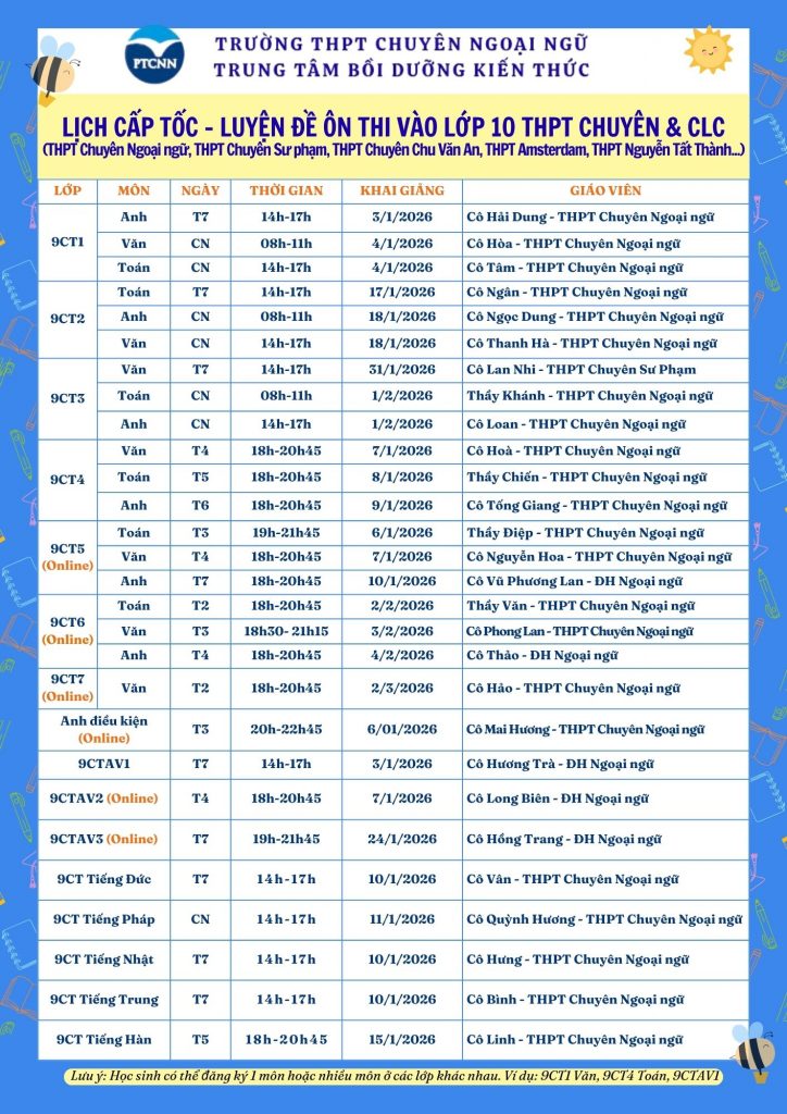 Phụ huynh và học sinh có thể tham khảo thêm lịch học của các khối lớp khác tại Fanpage: THPT Chuyên ngoại ngữ – Trung tâm Bồi dưỡng kiến thức